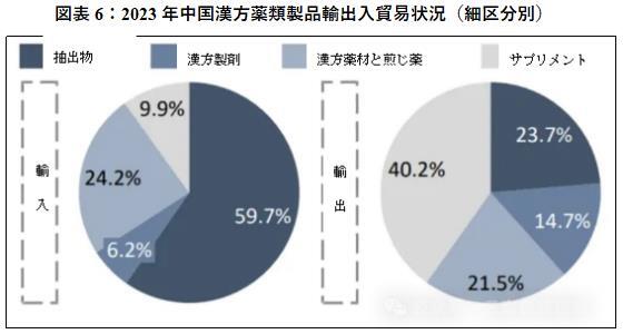 漢方薬材の細分化分野の輸出入状況を見ると、漢方薬材抽出物は59.7%の割合で輸入貿易でトップを占め、漢方薬煎じ薬と漢方薬ヘルスケア製品はそれぞれ21.5%と40.2%で輸出主力となっている。長期的には、政策支援と国際貿易環境の改善に伴い、中国漢方薬類製品の輸出入貿易は安定しながら好転に向かう見込みである。