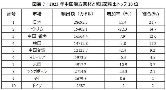 輸出市場から見ると、RCEP地区はすでに中国の漢方薬材と煎じ薬輸出の主要な目的地となっており、トップ10市場のうち、日本、ベトナム、中国香港、韓国、中国台湾、マレーシア、シンガポール、タイは輸出総額の80%近くを占め、トップ10市場のうち日本、香港、タイだけがプラス成長を維持している一方、他の市場はいずれもそれぞれの程度で下落している。2023年、日本市場シェアは21.7%を占め、輸出額は前年同期比15.4%増の28692.3万ドルであった。ベトナム向け年間輸出額は前年同期比22.3%減少した。主に大口品種の肉桂による影響によるものである。肉桂は中国のベトナム向け輸出総額の半分を占め、2023年には前年同期比49.5%減で14189.3万ドルから7159.6万ドルに激減した。