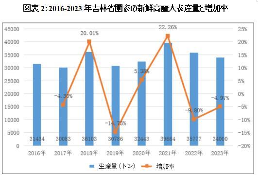 2023年、吉林省は園参栽培面積14.5万ムー(新鮮高麗人参産量3.4万トン)、林下参面積116.5万ムー(新鮮高麗人参産量781.8トン)であった。2023年吉林省の高麗人参産業総合生産額は前年同期比10.3%増の708.5億元であった。そのうち、第一次産業126.3億元(17.8%)、第二次産業244.8億元(34.6%)、第三次産業337.4億元(47.6%)であった。