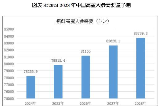 高麗人参産業の下流需要の多様化に伴い、高麗人参市場におけるニーズ増の傾向を示し、今後数年で中国国内の高麗人参需要量はさらに急増する見込みで、2028年には中国の高麗人参需要量は83739.3トンに達する見込みである。