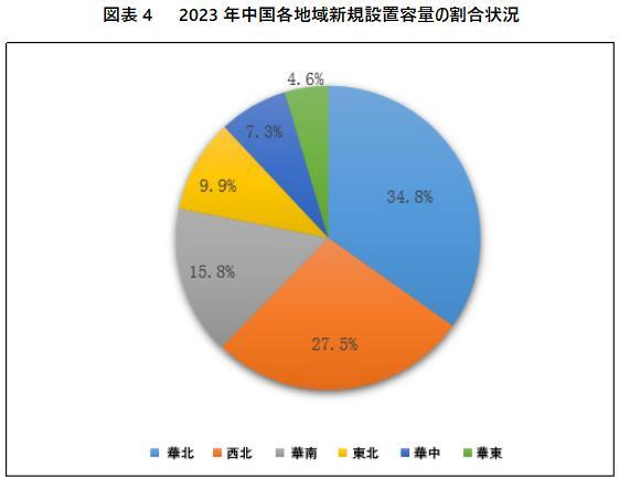 2023年、全国の6つの地域の風力発電の新規設置容量の割合はそれぞれ華北34.8%、西北27.5%、華南15.8%、東北9.9%、華中7.3%、華東4.6%である。三北地区の新規設置容量の割合は72%で、中東南部地区の新規設置容量の割合は28%に達した。