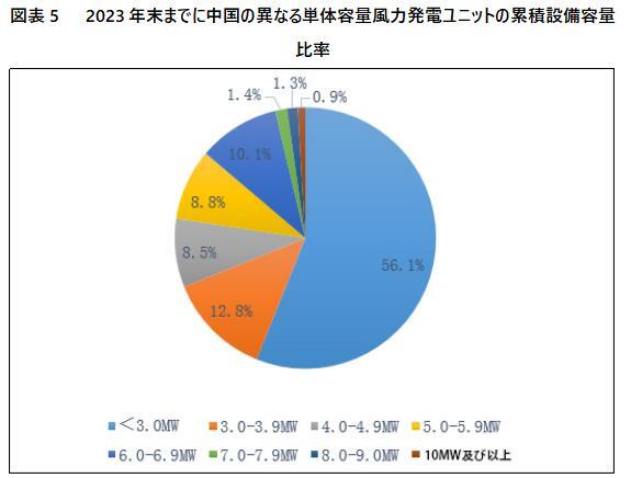 2023年末時点で、3.0MW以下(3.0MWを含まない)の風力発電ユニットの累積設置容量の割合は、2022年の67.3%から56.1%に減少した。3.0MW以上5.0MW未満(5.0MWを含まない)の風力発電ユニットの累積設置容量の割合は21.3%で、2022年と比べて約1ポイント低下した。5.0MW以上の風力発電ユニットの累積設置容量の割合は22.6%に達し、2022年と比べて約10ポイント増加した。