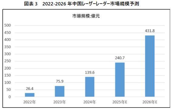 自動運転車規模の拡大、高度な運転支援におけるレーザーレーダーアプリケーションの普及率の向上、ロボットやスマートシティの建設などの分野での需要に後押しされて、中国レーザーレーダー市場は急成長している。2023年中国レーザーレーダー市場の規模は約75.9億元である。2026年に431.8億元に達すると予想されている。