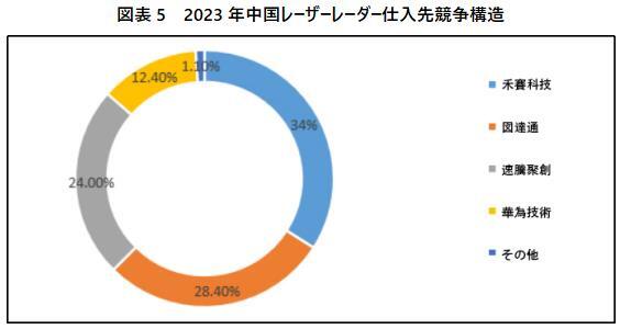 2023年のレーザーレーダー業界では、市場集中度が高く、業界の競争が激化している。主要企業の中で、禾賽科技は34%の市場シェアを獲得し、レーザーレーダー業界のトップに立っている。図達通は、蔚来汽車からの継続的な出荷により、28.4%の市場シェアを獲得し、第二位を占めている。さらに、速騰聚創と華為技術の市場シェアは、それぞれ24.0%、12.4%となっている。