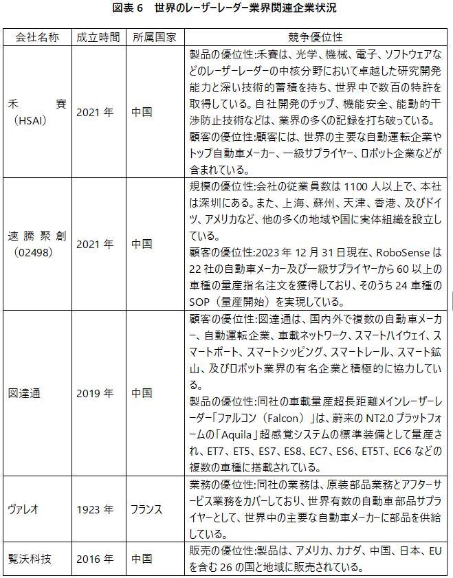企業に関しては、世界のレーザーレーダー関連企業には主に禾賽(HSAI)、速騰聚創(02498)、図達通、ヴァレオと覧沃科技などがあり、それらの競争優位性は以下の通りである。