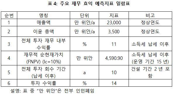프로젝트가 설계 생산 능력의 생산량에 도달한 후 연간 매출액 2억 3천만 위안, 연간 순이익은 3,500만 위안, 투자회수기 10년(납세 이후, 건설 기간 2년 포함), 투자 수익률은 14%이다.