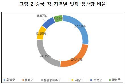 중국에서 지역별 볏짚 생산량을 살펴보면, 생산량이 많은 순서대로 화북 지역, 동북 지역, 장강 중하류 지역, 서남 지역, 서북 지역, 화남 지역으로 각각 전국 볏짚 총량의 27.18%, 24.47%, 24.35%, 9.19%, 8.87%, 5.94%를 차지한다.