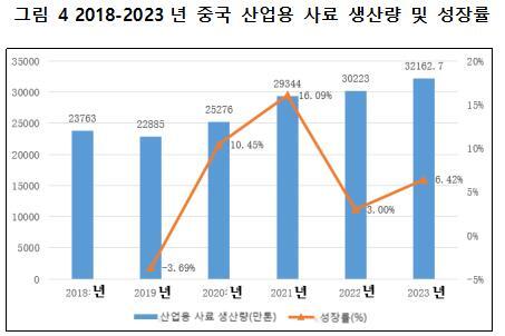 중국은 세계 최대 산업용 사료 생산국이자 소비국이다. 축산업의 지속적인 성장과 함께 산업용 사료 시장 규모도 꾸준히 확대되고 있다. 농업 현대화 및 축산업 발전에 힘입어, 산업용 사료 산업은 안정적인 성장 속도를 유지하고 있다. 중국 사료공업협회 통계에 따르면, 2018년부터 2023년까지 중국의 총 사료 생산량은 23,763만 톤에서 32,162.7만 톤으로 증가하였으며, 연평균 복합 성장률(CAGR)은 6.45%를 기록하였다.