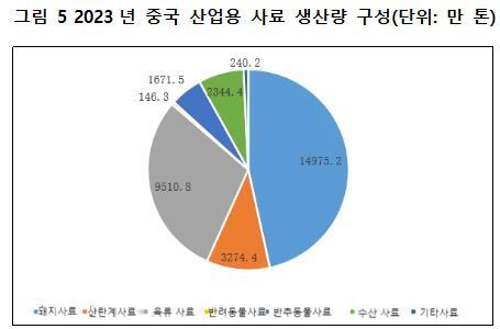 2023년, 중국의 산업용 사료 총생산량은 32,162.7만 톤으로, 전년 대비 6.42% 증가하였다. 사료 품목별 생산량을 살펴보면, 돼지 사료 생산량이 14,975.2만 톤으로 10.1% 증가하여 가장 많이 증가하였고, 산란계 사료 생산량은 3,274만 4,000톤으로 2.0% 증가하였으며, 육류 사료 생산량은 9,510.8만 톤으로 6.6% 증가하였고, 반추동물 사료 생산량은 1671만 5천 톤으로 3.4% 증가하였으며, 수산 사료 생산량은 2,344만 4,000톤으로 4.9% 감소하였고, 반려동물 사료 생산량은 146만 3천 톤으로 18.2% 증가하였으며, 기타 사료 생산량은 240만 2천 톤으로 7.6% 증가했다.