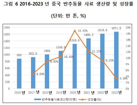 중국사료공업협회 데이터에 따르면, 2016년 이후 중국의 반추동물 산업용 사료 생산량은 단계적으로 증가하였으며, 2018년에는 1,000만 톤을 돌파하였다. 2022년 반추동물 사료 생산량은 1,616.8만 톤으로 전년 대비 9.22% 증가하였고, 2023년 반추동물 사료 생산량은 1,671.5만 톤으로 전년 대비 3.38% 증가하였다. 그러나 중국의 축산업 구조 특성상, 반추동물 사료의 연구 및 생산이 전체 사료 산업 시장에서 차지하는 비율은 상대적으로 낮다. 최근 들어 점진적으로 증가하고 있으나, 여전히 전체 산업용 사료 시장에서의 비중은 5% 수준에 불과하다. 따라서, 향후 중국 축산업의 지속적인 발전과 함께 반추동물 사료 시장 역시 더 큰 성장 기회를 맞이할 것으로 예상된다.