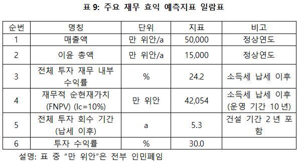 프로젝트가 설계 생산 능력의 생산량에 도달한 후 연간 매출액 5억 위안, 연간 순이익은 1억 5천만 위안, 투자회수기 5.3년(납세 이후, 건설 기간 2년 포함), 투자 수익률은 30.0%이다.