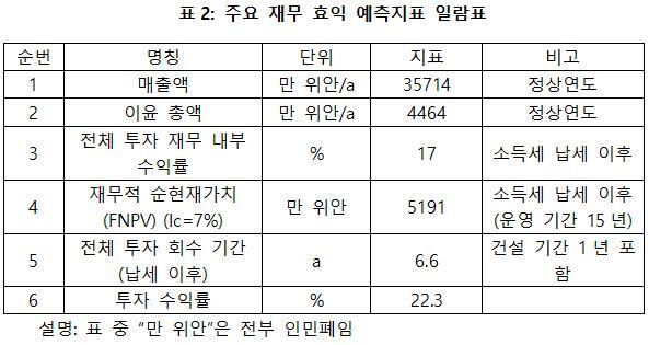 프로젝트가 설계 생산 능력의 생산량에 도달한 후 연간 매출액 3억5,714만 위안, 연간 순이익은 4,464만 위안, 투자회수기 6.6년(납세 이후, 건설 기간 1년 포함), 투자 수익률은 22.3%이다.