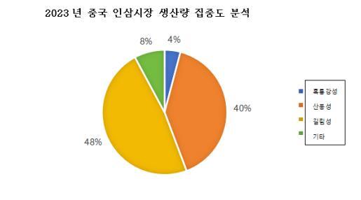 인삼은 중국의 대표적인 전통 한약재로, 오랜 역사를 가지고 있으며, 약리 활성이 뛰어나고 영양 가치가 매우 풍부한 약식 겸용 한약재로 널리 활용된다. 중국은 세계 최대의 인삼 생산국으로, 2015년부터 2022년까지 인삼 생산량이 3.37만 톤에서 8.8만 톤으로 증가하였으며, 같은 기간 동안 수요량도 3.3만 톤에서 9만 톤으로 증가하였다. 무역 현황을 살펴보면, 2023년 중국의 인삼 수입량은 3693.1톤으로 전년 대비 86.85% 증가하였으며, 수출량은 1803.4톤으로 전년 대비 0.49% 증가하였다. 중국의 주요 인삼 생산지는 동북 3성에 집중되어 있다. 2023년 데이터에 따르면, 흑룡강성의 인삼 생산량은 약 4.42만 톤으로 전체 시장의 약 4%를 차지하며, 길림성의 인삼 생산량은 약 3.48만 톤으로 전체 시장의 48%를 점유하고 있다. 요녕성의 생산량은 0.48만 톤으로 집계되었다.