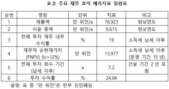 프로젝트가 설계 생산 능력의 생산량에 도달한 후 연간 매출액 7억6,923만 위안, 연간 순이익은 9,615만 위안, 투자회수기 7.2년(납세 이후, 건설 기간 2년 포함), 투자 수익률은 24.04%이다.