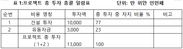 프로젝트의 총 투자는 13,000만 위안이며, 그 중 건설 투자가 10,000만 위안이다.
