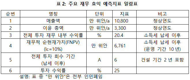 프로젝트 가동 후, 연 평균 매출액 10,800만 위안, 이윤 3,300만 위안, 투자회수기 6년 (납세 이후, 건설기간 2년 포함), 투자 수익률 25%.