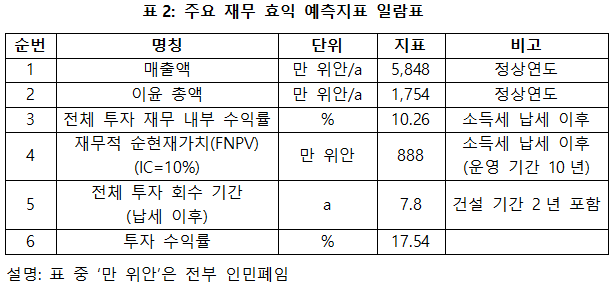 프로젝트가 설계 생산 능력의 생산량에 도달한 후, 연평균 매출액 5,848만 위안, 이윤 1,754만 위안, 투자회수기 7.7년(납세 이후, 건설 기간 2년 포함), 투자 수익률은 17.54%이다.