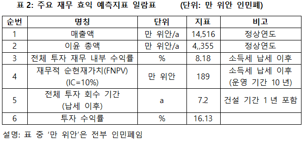 프로젝트가 설계 생산 능력의 생산량에 도달한 후, 연평균 매출액 14,516만 위안, 이윤 4,335만 위안, 투자회수기 7.2년(납세 이후, 건설 기간 1년 포함), 투자 수익률은 16.13%이다.