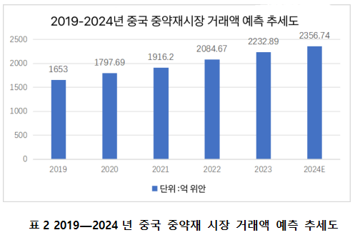 중약재는 약재의 품질과 효능이 우수하여 장기간 사용 시 의사와 환자로부터 널리 인정받고 있으며, 시장의 거래액은 꾸준히 증가하고 있다. 2022년 중국 중약재 시장 거래액은 2084.67억 위안에 달했으며, 전년 대비 8.8% 증가했다. 2023년 거래액은 약 2232.89억 위안이다. 2024년 중국 중약재 시장 거래액은 2356.74억 위안에 이를 것으로 예상된다.