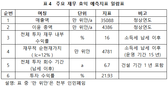 프로젝트가 설계 생산 능력의 생산량에 도달한 후, 연평균 매출액 35,088만 위안, 이윤 4,386만 위안, 투자회수기 6.7년(납세 이후, 건설 기간 1년 포함), 투자 수익률은 21.93%이다.