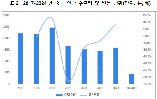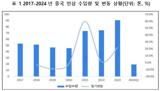 최근 몇 년 동안 중국의 인삼 생산 및 판매량은 성장 추세를 유지하고 있으며 2021년 중국의 신선한 인삼 생산량은 69,850톤에 달했으며 그 중 길림 56.78%, 흥룡강28.63%, 료녕 7.37%, 수요는 7,0031.9톤에 달했다. 가격 추이를 보면 2014년부터 중국 신선 인삼 시장의 평균 가격이 점차 하락하기 시작했으며2021년 중국 신선 인삼 시장의 평균 가격은 121.4위안/kg이었고, 2023년 중국 신선 인삼 시장의 평균 가격은 약 120.6위안/kg이었다.