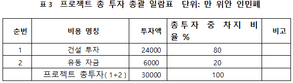이 프로젝트의 총 투자액은 30,000만 위안이며 그 중 건설 투자액은 24,000만 위안, 운전 자본은 6000만 위안이다.