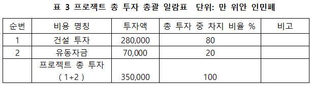 프로젝트 총 투자는 350,000만 위안이며, 그 중 건설 투자는 280,000만 위안, 유동 자금은 70,000만 위안이다.