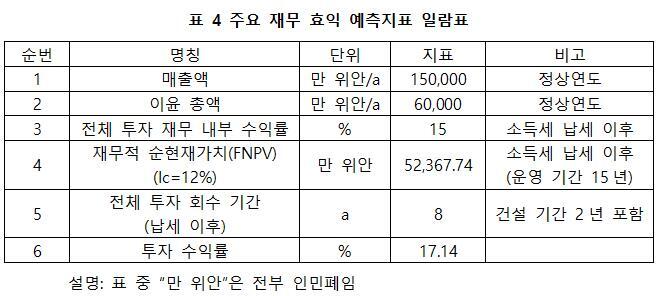 프로젝트가 설계 생산 능력의 생산량에 도달한 후 연간 매출액 150,000만 위안, 이윤 60,000만 위안, 투자 회수기 8년(납세 이후, 건설 기간 2년 포함), 투자 수익률 17.14%.