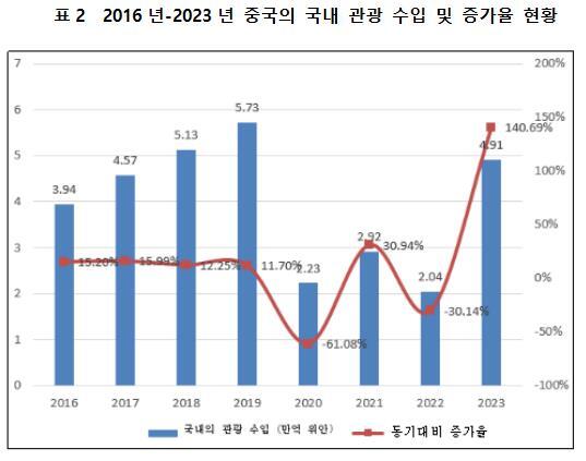 2023년 중국의 국내 관광 수입(여행 총 지출)은 4.91만억 위안으로, 전년 대비 2.87만억 위안 증가하며 140.69%의 큰 폭 성장을 기록했다. 이는 2020년 이후 지속된 관광업의 침체 국면을 반전시킨 중요한 성과이다. 또한 코로나19 이전인 2019년 대비 2023년 국내 관광 수입은 2019년 동기 대비 85.69%를 회복하며 격차가 크게 줄어들었다. 이는 국내 관광 소비의 활력과 잠재력을 잘 보여주는 지표라고 할 수 있다. 2023년 중국 국내 관광객의 총 지출 중 도시 주민의 여행 지출은 41781억 위안으로 147.5% 증가했으며, 농촌 거주자의 여행 지출은 7353억 위안으로 106.4% 증가했다. 또한 입국 관광객의 총 지출은 530억 달러를 기록했다.