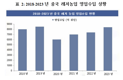 최근 도시와 농촌 주민들의 생활 수준 향상과 소비 구조의 업그레이드로 레저 농업 시장 수요는 더욱 증가할 전망이다. 특히 농촌 진흥 전략의 추진에 따라 국가는 더 많은 지원 정책을 발표하여 레저 농업 산업의 빠른 발전을 촉진하고 있다. 수치가 보여준데 따르면 2015-2019년 중국의 레저농업 영업수입은 끊임없이 성장하는 상태를 유지했다. 2020년 중국의 레저 농업 영업 수입은 6,049억 위안으로 28.8% 감소했는데 이는 주로 전염병의 영향으로 주민들의 외출관광 수요가 억제되면서 레저 농업이 심각한 충격을 받았기때문이다. 외출 제한이 풀리면서 오랫동안 억눌려 있던 관광 소비가 성장을 가져오게 되었고 나아가 레저 농업의 안정적인 성장을 이끌어 2023년 중국 레저 농업 영업수입은 8,400억 위안에 이르러 관광업에서 두드러진 분야가 되었다.