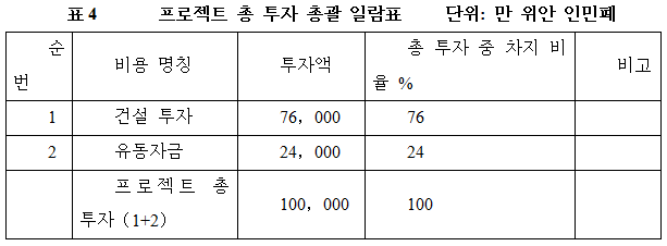 본 프로젝트의 총 투자는 100,000만 위안이며, 그 중: 건설 투자가 76,000만 위안, 유동 자금은 24,000만 위안이다.