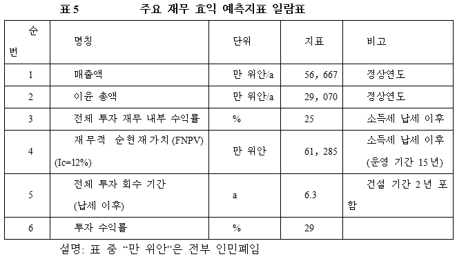 프로젝트가 설계 생산 능력의 생산량에 도달한 후, 연 평균 매출액 56,667만 위안, 이윤 29,070만 위안, 투자회수기 6.3년 (납세 이후, 건설기간 2년 포함), 투자 수익률 29%.