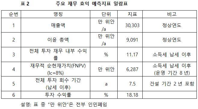 프로젝트가 설계 생산 능력의 생산량에 도달한 후, 연 평균 매출액 30,303만 위안, 이윤 9,091만 위안, 투자회수기 7.5년 (납세 이후, 건설기간 2년 포함), 투자 수익률 18.18%.