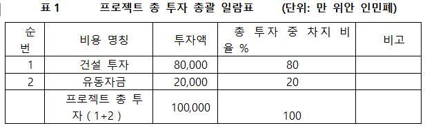 프로젝트의 총 투자는 100,000만 위안이며, 그 중 건설 투자가 80,000만 위안이다.