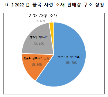 연자성 소재는 자성 소재의 일종으로, 판매량 비율을 보면 2022년 중국 자성 소재 전체 판매량 중 연자성 페라이트 판매량이 22.1%를 차지하여 전체 자성 소재 판매량에서 2위의 높은 순위를 차지했다.