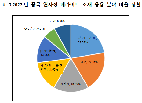 연자성 페라이트 소재는 산업 사슬의 하류에 널리 사용되며, 그 중 통신, 가전제품 및 자동차는 중국 페라이트 연자성 소재의 세 가지 주요 응용 분야로, 각각 전체 수요의 22.32%, 19.16% 및 16.85%를 차지한다. 통신 분야는 주로 휴대폰, 충전기, 기지국, 프로그래머블 스위치 등 자성 안테나 전자기 용기, 전원 교환기 및 필터에 사용된다. 5G 기술 배치의 가속화와 더불어 이 분야의 수요가 더욱 증가할 것으로 예상된다. 조사에 따르면, 2022년 중국의 연자성 페라이트 소재 응용 분야 비중은 다음과 같다.