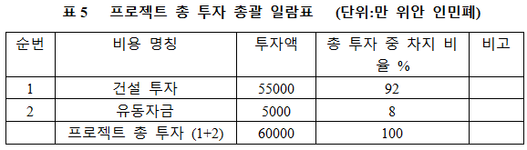 프로젝트의 총 투자는 60,000만 위안이며, 그 중 건설 투자가 55,000만 위안, 유동자금은 5,000만 위안이다.