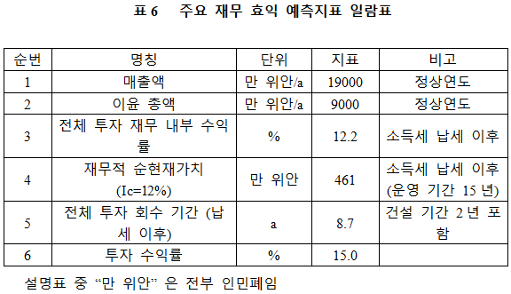 프로젝트가 설계 생산 능력의 생산량에 도달한 후 연간 매출액 19,000만 위안, 이윤 9,000만 위안, 투자 회수 기간 8.7년(납세 이후, 건설 기간 2년 포함), 투자 이익률 15.0%이다.