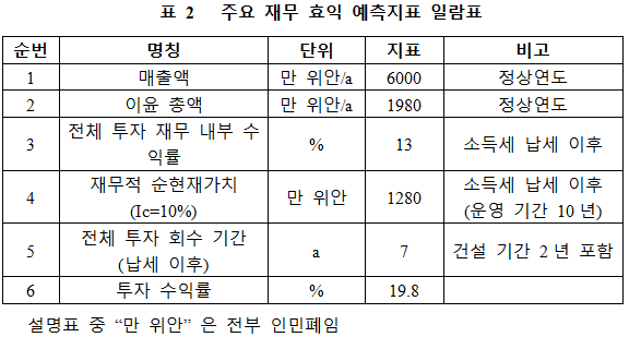 프로젝트가 설계 생산 능력의 생산량에 도달한 후 연간 매출액 6,000만 위안, 이윤 1,980만 위안, 투자 회수 기간 7년(납세 이후, 건설 기간 2년 포함), 투자 이익률 19.8%이다.