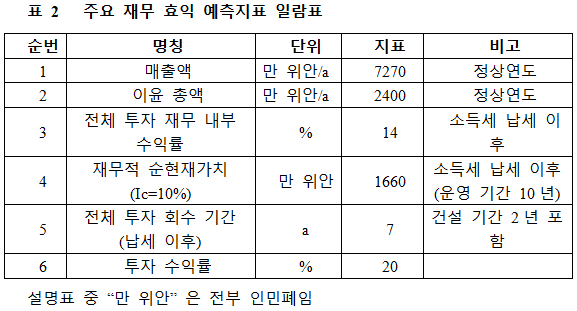프로젝트가 설계 생산 능력의 생산량에 도달한 후 연간 매출액 7,270만 위안, 이윤 2,400만 위안, 투자 회수 기간 7년(납세 이후, 건설 기간 2년 포함), 투자 이익률 20%이다.