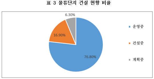 이번 조사에 포함된 2,769개 단지 중 운영 상태(물류 업무를 수행 중인 단지)는 2,127개로 76.8%를 차지하며, 2022년 조사의 74.6%보다 2.2% 증가했습다. 건설 중인 상태(착공했지만 개업하지 않은 단지)는 468개로 16.9%를 차지하며, 2022년 조사의 15.5%보다 1.4% 증가했다. 계획 상태(타당성 조사를 시작했지만 아직 착공하지 않은 단지)는 174개로 6.3%를 차지하며, 2022년 조사의 9.9%보다 3.6%포인트 감소했다.
