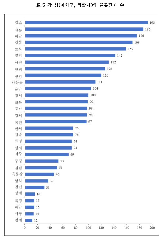 물류 단지 총수에서 상위 세 개 성은 각각 강소, 산동, 하남이다. 전국에 12개 성의 물류 단지 수가 100개 이상에 달한다.