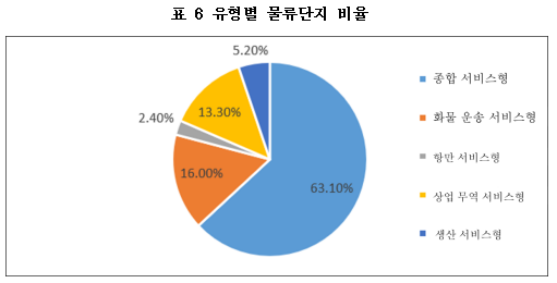 단지가 의존하는 물류 자원과 시장 수요의 특성 및 서비스 대상과 기능에 따라 화물 운송 서비스형, 생산 서비스형, 상업 무역 서비스형, 항만 서비스형 및 종합 서비스형의 5가지 범주로 나뉜다. 조사 결과에 따르면 종합 서비스형 단지가 63.1%로 비율이 가장 높고, 화물 서비스형 단지가 16.0%, 상업 서비스형 단지가 13.3%, 생산 서비스형 및 항만 서비스형 물류 단지가 각각 5.2% 및 2.4%로 그 뒤를 잇는다.