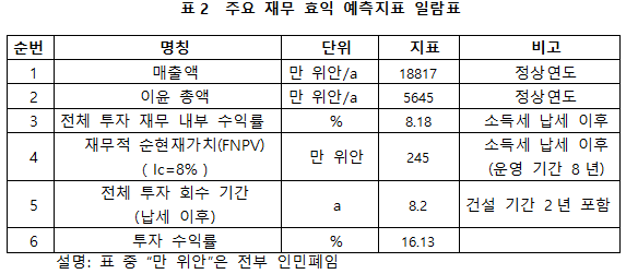 프로젝트가 설계 생산 능력의 생산량에 도달한 후 연간 매출액 18817만 위안, 이윤 5645만 위안, 투자 회수 기간 8.2년(납세 이후, 건설 기간 2년 포함), 투자 수익률은 16.13%이다.