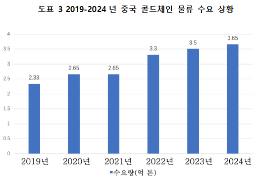 콜드체인 물류는 현대 농업, 식품 가공, 의약품 등 생산측과 소비측을 연결하며, 산업 체인을 확장하고 공급망을 구축하며 가치 사슬을 향상시키는 중요한 지지대이다. 근년래 정책 지원과 하류 산업의 지속적인 발전을 배경으로 중국의 콜드체인 물류 수요 총량이 계속 확대되었다. 2023년 중국 콜드체인 물류 시장은 전체적으로 압박을 받으며 전진하고 수요가 점차 안정되고 회복되는 변동 발전 국면에 있으며, 콜드체인 물류 수요 총량은 약 3억 5천만 톤으로 전년 대비 6.1% 증가했다. 2024년 중국의 콜드체인 물류 총수요는 3억 6,500만 톤에 달했다.