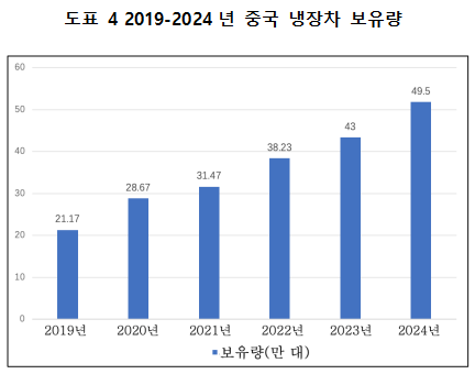 콜드체인 물류 수요 증가와 신에너지 냉장차 기술의 보급 및 응용 덕분에 중국의 냉장차 보유량은 꾸준한 증가 추세를 보이고 있다. 2023년 전국 냉장차 시장 보유량은 43만 2천 대에 달했으며, 전년 대비 4만 9천 7백 대 증가하여 전년 대비 12.9% 늘어났다. 2024년 중국의 냉장차 보유량이 49만 5천대에 달하려 전년 동기 대비 14.58% 늘어났다.