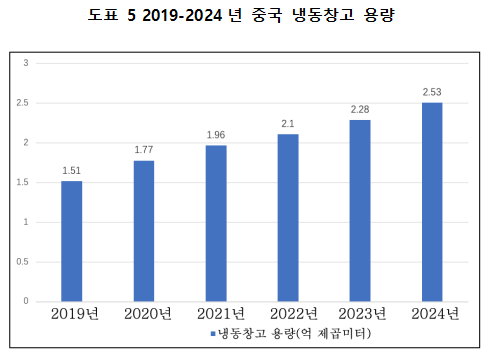 냉장창고는 콜드체인 물류의 “거점”이라 할 수 있으며 냉장창고의 건설과 발전은 국가 중추 콜드체인 물류 기지의 최우선 과제로 되었다. 2023년 전국 냉장 창고 총량은 약 2억 2,800만 입방미터로, 전년 대비 1,800만 입방미터 증가하여 전년 대비 8.3% 늘어났다. 2024년 중국의 냉동 창고 총 용량은 2억 5,300만 입방미터에 달해 전년 대비 10.96% 늘어났다.