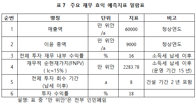 프로젝트가 설계 생산 능력의 생산량에 도달한 후 연간 매출액 60000만 위안, 이윤 9000만 위안, 투자 회수 기간 8년(납세 이후, 건설 기간 2년 포함), 투자 수익률은 18%이다.