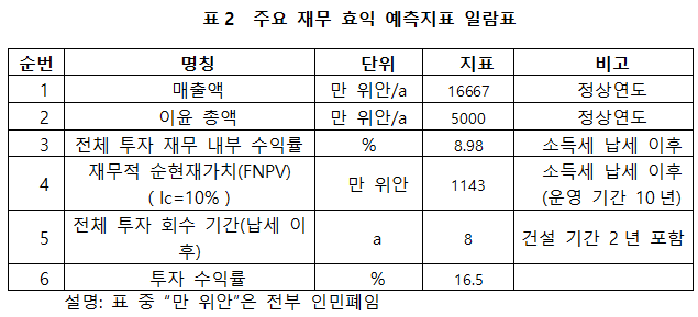 프로젝트가 설계 생산 능력의 생산량에 도달한 후 연간 매출액 16667만 위안, 이윤 5000만 위안, 투자 회수 기간 8년(납세 이후, 건설 기간 2년 포함), 투자 수익률은 16.5%이다.
