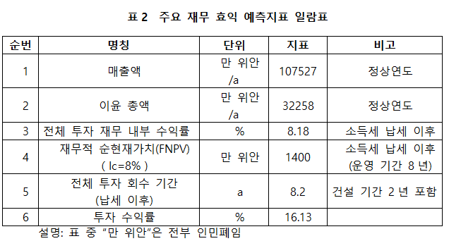 프로젝트가 설계 생산 능력의 생산량에 도달한 후 연간 매출액 107527만 위안, 이윤 32258만 위안, 투자 회수 기간 8.2년(납세 이후, 건설 기간2년 포함), 투자 수익률은 16.13%이다.